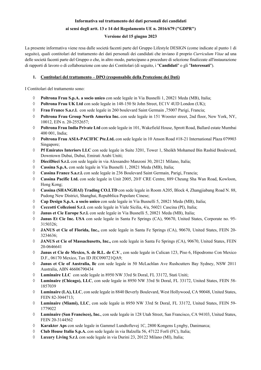 Informativa sul trattamento dei dati personali dei candidati ai sensi degli artt. 13 e 14 del Regolamento UE n. 2016/679 ("GDPR") Versione del 15 giugno 2023 La presente informativa viene resa dalle società facenti parte del Gruppo Lifestyle DESIGN (come indicate al punto 1 di seguito), quali contitolari del trattamento dei dati personali dei candidati che inviano il proprio Curriculum Vitae ad una delle società facenti parte del Gruppo o che, in altro modo, partecipano a procedure di selezione finalizzate all'instaurazione di rapporti di lavoro o di collaborazione con uno dei Contitolari (di seguito, i "Candidati" o gli "Interessati"). 1. Contitolari del trattamento – DPO (responsabile della Protezione dei Dati) I Contitolari del trattamento sono: Poltrona Frau S.p.A. a socio unico con sede legale in Via Busnelli 1, 20821 Meda (MB), Italia; Poltrona Frau UK Ltd con sede legale in 148-150 St John Street, EC1V 4UD London (UK); Frau France S.a.r.l. con sede legale in 260 boulevard Saint Germain ,75007 Parigi, Francia; Poltrona Frau Group North America Inc. con sede legale in 151 Wooster street, 2nd floor, New York, NY, 10012, EIN n. 20-2552657; Poltrona Frau India Private Ltd con sede legale in 101, Wakefield House, Sprott Road, Ballard estate Mumbai 400 001, India; Poltrona Frau ASIA-PACIFIC Pte.Ltd. con sede legale in 10 Anson Road #18-21 International Plaza 079903 Singapore; Pf Emirates Interiors LLC con sede legale in Suite 3201, Tower 1, Sheikh Mohamed Bin Rashid Boulevard, Downtown Dubai, Dubai, Emirati Arabi Uniti; DieciDieci S.r.l. con sede legale in via Alessandro Manzoni 30, 20121 Milano, Italia; Cassina S.p.A. con sede legale in Via Busnelli 1, 20821 Meda (MB), Italia; Cassina France S.a.r.l. con sede legale in 236 Boulevard Saint Germain, Parigi, Francia; Cassina Pacific Ltd. con sede legale in Unit 2005, 20/F CRE Centre, 889 Cheung Sha Wan Road, Kowloon, Hong Kong; Cassina (SHANGHAI) Trading CO.LTD con sede legale in Room A205, Block 4, Zhangjiabang Road N. 88, Pudong New District, Shanghai, Repubblica Popolare Cinese; Cap Design S.p.A. a socio unico con sede legale in Via Busnelli 5, 20821 Meda (MB), Italia; Ceccotti Collezioni S.r.l. con sede legale in Viale Sicilia, 4/a, 56021 Cascina (PI), Italia; Janus et Cie Europe S.r.l. con sede legale in Via Busnelli 5, 20821 Meda (MB), Italia; Janus Et Cie Inc. USA con sede legale in Santa Fe Springs (CA), 90670, United States, Corporate no. 95- 3150326; JANUS et Cie of Florida, Inc., con sede legale in Santa Fe Springs (CA), 90670, United States, FEIN 20- 3234636; JANUS et Cie of Massachusetts, Inc., con sede legale in Santa Fe Springs (CA), 90670, United States, FEIN 20-0646641 Janus et Cie de Mexico, S. de R.L. de C.V., con sede legale in Culican 123, Piso 6, Hipodromo Con Mexico D.F., 06170 Mexico, Tax ID JEC090721QA9; Janus et Cie of Australia, llc con sede legale in 50 McLachlan Ave Rushcutters Bay Sydney, NSW 2011 Australia, ABN 46606790434 Luminaire LLC con sede legale in 8950 NW 33rd St Doral, FL 33172, Stati Uniti; Luminaire (Chicago), LLC, con sede legale in 8950 NW 33rd St Doral, FL 33172, United States, FEIN 58- 1857039 Luminaire (LA), LLC, con sede legale in 8840 Beverly Boulevard, West Hollywood, CA 90048, United States, FEIN 82-3044713; Luminaire (Miami), LLC, con sede legale in 8950 NW 33rd St Doral, FL 33172, United States, FEIN 59- 1779022 Luminaire (San Francisco), Inc., con sede legale in 128 Utah Street, San Francisco, CA 94103, United States, FEIN 20-3144562 Karakter Aps con sede legale in Gammel Lundtoftevej 1C, 2800 Kongens Lyngby, Danimarca; Club House Italia S.p.A. con sede legale in via Balzella 56, 47122 Forlì (FC), Italia; Luxury Living S.r.l. con sede legale in via Durini 23, 20122 Milano (MI), Italia;