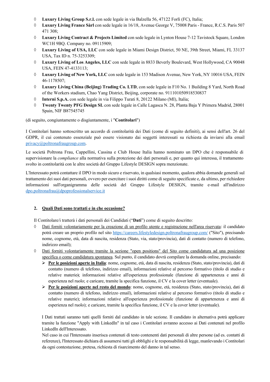 Luxury Living Group S.r.l. con sede legale in via Balzella 56, 47122 Forlì (FC), Italia; Luxury Living France Sàrl con sede legale in 16/18, Avenue George V, 75008 Paris - France, R.C.S. Paris 507 471 308; Luxury Living Contract & Projects Limited con sede legale in Lynton House 7-12 Tavistock Square, London WC1H 9BQ. Company no. 09115909; Luxury Living of USA, LLC con sede legale in Miami Design District, 50 NE, 39th Street, Miami, FL 33137 USA, Tax ID n. 75-3253309; Luxury Living of Los Angeles, LLC con sede legale in 8833 Beverly Boulevard, West Hollywood, CA 90048 USA, FEIN 47-4133113; Luxury Living of New York, LLC con sede legale in 153 Madison Avenue, New York, NY 10016 USA, FEIN 46-1178507; Luxury Living China (Beijing) Trading Co. LTD, con sede legale in F10 No. 1 Building 8 Yard, North Road of the Workers stadium, Chao Yang District, Beijing, corporate no. 911101050918530837 Interni S.p.A. con sede legale in via Filippo Turati 8, 20122 Milano (MI), Italia; Twenty Twenty PFG Design SL con sede legale in Calle Lagasca N. 28, Planta Baja Y Primera Madrid, 28001 Spain, NIF B87545745 (di seguito, congiuntamente o disgiuntamente, i "Contitolari") I Contitolari hanno sottoscritto un accordo di contitolarità dei Dati (come di seguito definiti), ai sensi dell'art. 26 del GDPR, il cui contenuto essenziale può essere visionato dai soggetti interessati su richiesta da inviarsi alla email privacy@poltronafraugroup.com. Le società Poltrona Frau, Cappellini, Cassina e Club House Italia hanno nominato un DPO che è responsabile di supervisionare la compliance alla normativa sulla protezione dei dati personali e, per quanto qui interessa, il trattamento svolto in contitolarità con le altre società del Gruppo Lifestyle DESIGN sopra menzionate. L'Interessato potrà contattare il DPO in modo sicuro e riservato, in qualsiasi momento, qualora abbia domande generali sul trattamento dei suoi dati personali, ovvero per esercitare i suoi diritti come di seguito specificate e, da ultimo, per richiedere informazioni sull'organigramma delle società del Gruppo Lifestyle DESIGN, tramite e-mail all'indirizzo dpo.poltronafrau@dpoprofessionalservice.it 2. Quali Dati sono trattati e in che occasione? Il Contitolare/i tratterà i dati personali dei Candidati (“Dati”) come di seguito descritto: Dati forniti volontariamente per la creazione di un profilo utente e registrazione nell'area riservata: il candidato potrà creare un proprio profilo nel sito https://careers.lifestyledesign.poltronafraugroup.com/ ("Sito"), precisando nome, cognome, età, data di nascita, residenza (Stato, via, stato/provincia), dati di contatto (numero di telefono, indirizzo email); Dati forniti volontariamente tramite la sezione "open positions" del Sito come candidatura ad una posizione specifica o come candidatura spontanea. Sul punto, il candidato dovrà compilare la domanda online, precisando: ➢ Per le posizioni aperte in Italia: nome, cognome, età, data di nascita, residenza (Stato, stato/provincia), dati di contatto (numero di telefono, indirizzo email), informazioni relative al percorso formativo (titolo di studio e relative materie); informazioni relative all'esperienza professionale (funzione di appartenenza e anni di esperienza nel ruolo; e caricare, tramite la specifica funzione, il CV e la cover letter (eventuale). ➢ Per le posizioni aperte nel resto del mondo: nome, cognome, età, residenza (Stato, stato/provincia), dati di contatto (numero di telefono, indirizzo email), informazioni relative al percorso formativo (titolo di studio e relative materie); informazioni relative all'esperienza professionale (funzione di appartenenza e anni di esperienza nel ruolo); e caricare, tramite la specifica funzione, il CV e la cover letter (eventuale). I Dati trattati saranno tutti quelli forniti dal candidato in tale sezione. Il candidato in alternativa potrà applicare tramite la funzione "Apply with LinkedIn" in tal caso i Contitolari avranno accesso ai Dati contenuti nel profilo LinkedIn dell'Interessato. Nel caso in cui l'Interessato inserisca contenuti di testo contenenti dati personali di altre persone (ad es. contatti di referenze), l'Interessato dichiara di assumersi tutti gli obblighi e le responsabilità di legge, manlevando i Contitolari da ogni contestazione, pretesa, richiesta di risarcimento del danno in tal senso.