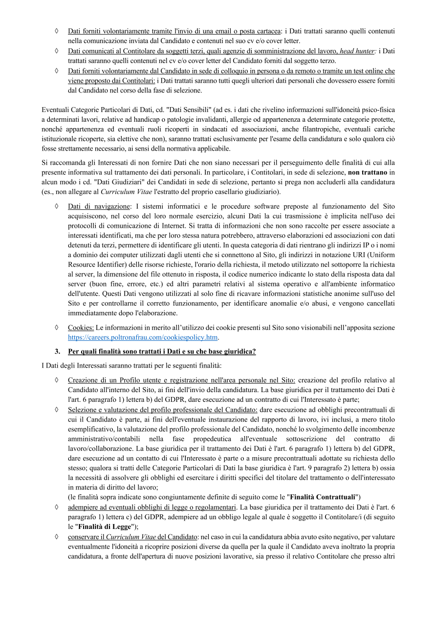 Dati forniti volontariamente tramite l'invio di una email o posta cartacea: i Dati trattati saranno quelli contenuti nella comunicazione inviata dal Candidato e contenuti nel suo cv e/o cover letter. Dati comunicati al Contitolare da soggetti terzi, quali agenzie di somministrazione del lavoro, head hunter: i Dati trattati saranno quelli contenuti nel cv e/o cover letter del Candidato forniti dal soggetto terzo. Dati forniti volontariamente dal Candidato in sede di colloquio in persona o da remoto o tramite un test online che viene proposto dai Contitolari: i Dati trattati saranno tutti quegli ulteriori dati personali che dovessero essere forniti dal Candidato nel corso della fase di selezione. Eventuali Categorie Particolari di Dati, cd. "Dati Sensibili" (ad es. i dati che rivelino informazioni sull'idoneità psico-fisica a determinati lavori, relative ad handicap o patologie invalidanti, allergie od appartenenza a determinate categorie protette, nonché appartenenza ed eventuali ruoli ricoperti in sindacati ed associazioni, anche filantropiche, eventuali cariche istituzionale ricoperte, sia elettive che non), saranno trattati esclusivamente per l'esame della candidatura e solo qualora ciò fosse strettamente necessario, ai sensi della normativa applicabile. Si raccomanda gli Interessati di non fornire Dati che non siano necessari per il perseguimento delle finalità di cui alla presente informativa sul trattamento dei dati personali. In particolare, i Contitolari, in sede di selezione, non trattano in alcun modo i cd. "Dati Giudiziari" dei Candidati in sede di selezione, pertanto si prega non accluderli alla candidatura (es., non allegare al Curriculum Vitae l'estratto del proprio casellario giudiziario). Dati di navigazione: I sistemi informatici e le procedure software preposte al funzionamento del Sito acquisiscono, nel corso del loro normale esercizio, alcuni Dati la cui trasmissione è implicita nell'uso dei protocolli di comunicazione di Internet. Si tratta di informazioni che non sono raccolte per essere associate a interessati identificati, ma che per loro stessa natura potrebbero, attraverso elaborazioni ed associazioni con dati detenuti da terzi, permettere di identificare gli utenti. In questa categoria di dati rientrano gli indirizzi IP o i nomi a dominio dei computer utilizzati dagli utenti che si connettono al Sito, gli indirizzi in notazione URI (Uniform Resource Identifier) delle risorse richieste, l'orario della richiesta, il metodo utilizzato nel sottoporre la richiesta al server, la dimensione del file ottenuto in risposta, il codice numerico indicante lo stato della risposta data dal server (buon fine, errore, etc.) ed altri parametri relativi al sistema operativo e all'ambiente informatico dell'utente. Questi Dati vengono utilizzati al solo fine di ricavare informazioni statistiche anonime sull'uso del Sito e per controllarne il corretto funzionamento, per identificare anomalie e/o abusi, e vengono cancellati immediatamente dopo l'elaborazione. Cookies: Le informazioni in merito all’utilizzo dei cookie presenti sul Sito sono visionabili nell’apposita sezione https://careers.poltronafrau.com/cookiespolicy.htm. 3. Per quali finalità sono trattati i Dati e su che base giuridica? I Dati degli Interessati saranno trattati per le seguenti finalità: Creazione di un Profilo utente e registrazione nell'area personale nel Sito: creazione del profilo relativo al Candidato all'interno del Sito, ai fini dell'invio della candidatura. La base giuridica per il trattamento dei Dati è l'art. 6 paragrafo 1) lettera b) del GDPR, dare esecuzione ad un contratto di cui l'Interessato è parte; Selezione e valutazione del profilo professionale del Candidato: dare esecuzione ad obblighi precontrattuali di cui il Candidato è parte, ai fini dell'eventuale instaurazione del rapporto di lavoro, ivi inclusi, a mero titolo esemplificativo, la valutazione del profilo professionale del Candidato, nonché lo svolgimento delle incombenze amministrativo/contabili nella fase propedeutica all'eventuale sottoscrizione del contratto di lavoro/collaborazione. La base giuridica per il trattamento dei Dati è l'art. 6 paragrafo 1) lettera b) del GDPR, dare esecuzione ad un contatto di cui l'Interessato è parte o a misure precontrattuali adottate su richiesta dello stesso; qualora si tratti delle Categorie Particolari di Dati la base giuridica è l'art. 9 paragrafo 2) lettera b) ossia la necessità di assolvere gli obblighi ed esercitare i diritti specifici del titolare del trattamento o dell'interessato in materia di diritto del lavoro; (le finalità sopra indicate sono congiuntamente definite di seguito come le "Finalità Contrattuali") adempiere ad eventuali obblighi di legge o regolamentari. La base giuridica per il trattamento dei Dati è l'art. 6 paragrafo 1) lettera c) del GDPR, adempiere ad un obbligo legale al quale è soggetto il Contitolare/i (di seguito le "Finalità di Legge"); conservare il Curriculum Vitae del Candidato: nel caso in cui la candidatura abbia avuto esito negativo, per valutare eventualmente l'idoneità a ricoprire posizioni diverse da quella per la quale il Candidato aveva inoltrato la propria candidatura, a fronte dell'apertura di nuove posizioni lavorative, sia presso il relativo Contitolare che presso altri