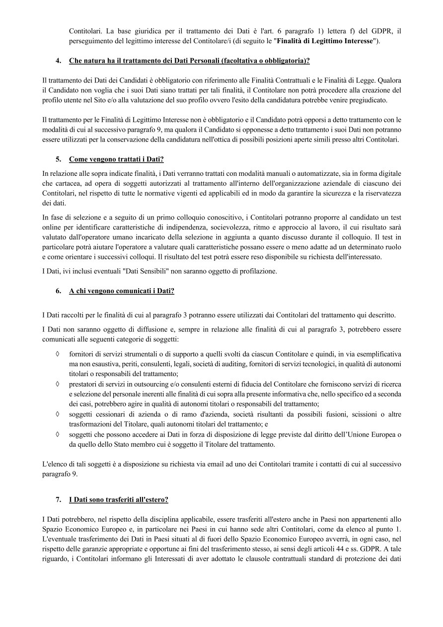 Contitolari. La base giuridica per il trattamento dei Dati è l'art. 6 paragrafo 1) lettera f) del GDPR, il perseguimento del legittimo interesse del Contitolare/i (di seguito le "Finalità di Legittimo Interesse"). 4. Che natura ha il trattamento dei Dati Personali (facoltativa o obbligatoria)? Il trattamento dei Dati dei Candidati è obbligatorio con riferimento alle Finalità Contrattuali e le Finalità di Legge. Qualora il Candidato non voglia che i suoi Dati siano trattati per tali finalità, il Contitolare non potrà procedere alla creazione del profilo utente nel Sito e/o alla valutazione del suo profilo ovvero l'esito della candidatura potrebbe venire pregiudicato. Il trattamento per le Finalità di Legittimo Interesse non è obbligatorio e il Candidato potrà opporsi a detto trattamento con le modalità di cui al successivo paragrafo 9, ma qualora il Candidato si opponesse a detto trattamento i suoi Dati non potranno essere utilizzati per la conservazione della candidatura nell'ottica di possibili posizioni aperte simili presso altri Contitolari. 5. Come vengono trattati i Dati? In relazione alle sopra indicate finalità, i Dati verranno trattati con modalità manuali o automatizzate, sia in forma digitale che cartacea, ad opera di soggetti autorizzati al trattamento all'interno dell'organizzazione aziendale di ciascuno dei Contitolari, nel rispetto di tutte le normative vigenti ed applicabili ed in modo da garantire la sicurezza e la riservatezza dei dati. In fase di selezione e a seguito di un primo colloquio conoscitivo, i Contitolari potranno proporre al candidato un test online per identificare caratteristiche di indipendenza, socievolezza, ritmo e approccio al lavoro, il cui risultato sarà valutato dall'operatore umano incaricato della selezione in aggiunta a quanto discusso durante il colloquio. Il test in particolare potrà aiutare l'operatore a valutare quali caratteristiche possano essere o meno adatte ad un determinato ruolo e come orientare i successivi colloqui. Il risultato del test potrà essere reso disponibile su richiesta dell'interessato. I Dati, ivi inclusi eventuali "Dati Sensibili" non saranno oggetto di profilazione. 6. A chi vengono comunicati i Dati? I Dati raccolti per le finalità di cui al paragrafo 3 potranno essere utilizzati dai Contitolari del trattamento qui descritto. I Dati non saranno oggetto di diffusione e, sempre in relazione alle finalità di cui al paragrafo 3, potrebbero essere comunicati alle seguenti categorie di soggetti: fornitori di servizi strumentali o di supporto a quelli svolti da ciascun Contitolare e quindi, in via esemplificativa ma non esaustiva, periti, consulenti, legali, società di auditing, fornitori di servizi tecnologici, in qualità di autonomi titolari o responsabili del trattamento; prestatori di servizi in outsourcing e/o consulenti esterni di fiducia del Contitolare che forniscono servizi di ricerca e selezione del personale inerenti alle finalità di cui sopra alla presente informativa che, nello specifico ed a seconda dei casi, potrebbero agire in qualità di autonomi titolari o responsabili del trattamento; soggetti cessionari di azienda o di ramo d'azienda, società risultanti da possibili fusioni, scissioni o altre trasformazioni del Titolare, quali autonomi titolari del trattamento; e soggetti che possono accedere ai Dati in forza di disposizione di legge previste dal diritto dell’Unione Europea o da quello dello Stato membro cui è soggetto il Titolare del trattamento. L'elenco di tali soggetti è a disposizione su richiesta via email ad uno dei Contitolari tramite i contatti di cui al successivo paragrafo 9. 7. I Dati sono trasferiti all'estero? I Dati potrebbero, nel rispetto della disciplina applicabile, essere trasferiti all'estero anche in Paesi non appartenenti allo Spazio Economico Europeo e, in particolare nei Paesi in cui hanno sede altri Contitolari, come da elenco al punto 1. L'eventuale trasferimento dei Dati in Paesi situati al di fuori dello Spazio Economico Europeo avverrà, in ogni caso, nel rispetto delle garanzie appropriate e opportune ai fini del trasferimento stesso, ai sensi degli articoli 44 e ss. GDPR. A tale riguardo, i Contitolari informano gli Interessati di aver adottato le clausole contrattuali standard di protezione dei dati