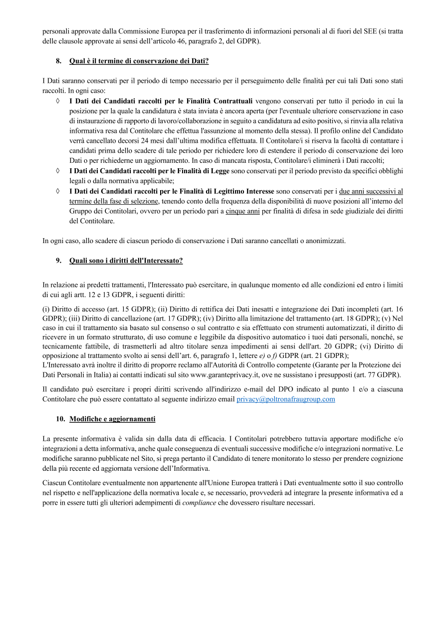 personali approvate dalla Commissione Europea per il trasferimento di informazioni personali al di fuori del SEE (si tratta delle clausole approvate ai sensi dell’articolo 46, paragrafo 2, del GDPR). 8. Qual è il termine di conservazione dei Dati? I Dati saranno conservati per il periodo di tempo necessario per il perseguimento delle finalità per cui tali Dati sono stati raccolti. In ogni caso: I Dati dei Candidati raccolti per le Finalità Contrattuali vengono conservati per tutto il periodo in cui la posizione per la quale la candidatura è stata inviata è ancora aperta (per l'eventuale ulteriore conservazione in caso di instaurazione di rapporto di lavoro/collaborazione in seguito a candidatura ad esito positivo, si rinvia alla relativa informativa resa dal Contitolare che effettua l'assunzione al momento della stessa). Il profilo online del Candidato verrà cancellato decorsi 24 mesi dall’ultima modifica effettuata. Il Contitolare/i si riserva la facoltà di contattare i candidati prima dello scadere di tale periodo per richiedere loro di estendere il periodo di conservazione dei loro Dati o per richiederne un aggiornamento. In caso di mancata risposta, Contitolare/i eliminerà i Dati raccolti; I Dati dei Candidati raccolti per le Finalità di Legge sono conservati per il periodo previsto da specifici obblighi legali o dalla normativa applicabile; I Dati dei Candidati raccolti per le Finalità di Legittimo Interesse sono conservati per i due anni successivi al termine della fase di selezione, tenendo conto della frequenza della disponibilità di nuove posizioni all’interno del Gruppo dei Contitolari, ovvero per un periodo pari a cinque anni per finalità di difesa in sede giudiziale dei diritti del Contitolare. In ogni caso, allo scadere di ciascun periodo di conservazione i Dati saranno cancellati o anonimizzati. 9. Quali sono i diritti dell'Interessato? In relazione ai predetti trattamenti, l'Interessato può esercitare, in qualunque momento ed alle condizioni ed entro i limiti di cui agli artt. 12 e 13 GDPR, i seguenti diritti: (i) Diritto di accesso (art. 15 GDPR); (ii) Diritto di rettifica dei Dati inesatti e integrazione dei Dati incompleti (art. 16 GDPR); (iii) Diritto di cancellazione (art. 17 GDPR); (iv) Diritto alla limitazione del trattamento (art. 18 GDPR); (v) Nel caso in cui il trattamento sia basato sul consenso o sul contratto e sia effettuato con strumenti automatizzati, il diritto di ricevere in un formato strutturato, di uso comune e leggibile da dispositivo automatico i tuoi dati personali, nonché, se tecnicamente fattibile, di trasmetterli ad altro titolare senza impedimenti ai sensi dell'art. 20 GDPR; (vi) Diritto di opposizione al trattamento svolto ai sensi dell’art. 6, paragrafo 1, lettere e) o f) GDPR (art. 21 GDPR); L'Interessato avrà inoltre il diritto di proporre reclamo all'Autorità di Controllo competente (Garante per la Protezione dei Dati Personali in Italia) ai contatti indicati sul sito www.garanteprivacy.it, ove ne sussistano i presupposti (art. 77 GDPR). Il candidato può esercitare i propri diritti scrivendo all'indirizzo e-mail del DPO indicato al punto 1 e/o a ciascuna Contitolare che può essere contattato al seguente indirizzo email privacy@poltronafraugroup.com 10. Modifiche e aggiornamenti La presente informativa è valida sin dalla data di efficacia. I Contitolari potrebbero tuttavia apportare modifiche e/o integrazioni a detta informativa, anche quale conseguenza di eventuali successive modifiche e/o integrazioni normative. Le modifiche saranno pubblicate nel Sito, si prega pertanto il Candidato di tenere monitorato lo stesso per prendere cognizione della più recente ed aggiornata versione dell’Informativa. Ciascun Contitolare eventualmente non appartenente all'Unione Europea tratterà i Dati eventualmente sotto il suo controllo nel rispetto e nell'applicazione della normativa locale e, se necessario, provvederà ad integrare la presente informativa ed a porre in essere tutti gli ulteriori adempimenti di compliance che dovessero risultare necessari.